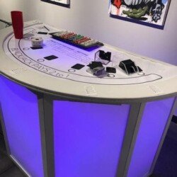 Hit you’re guests with a great time at your casino event! Our fabulous Blackjack tables are sure to keep them from splitting the party early. Combined with our entertaining dealers, these tables will keep your guests engaged all night. Ask about a Blackjack table for your event today!